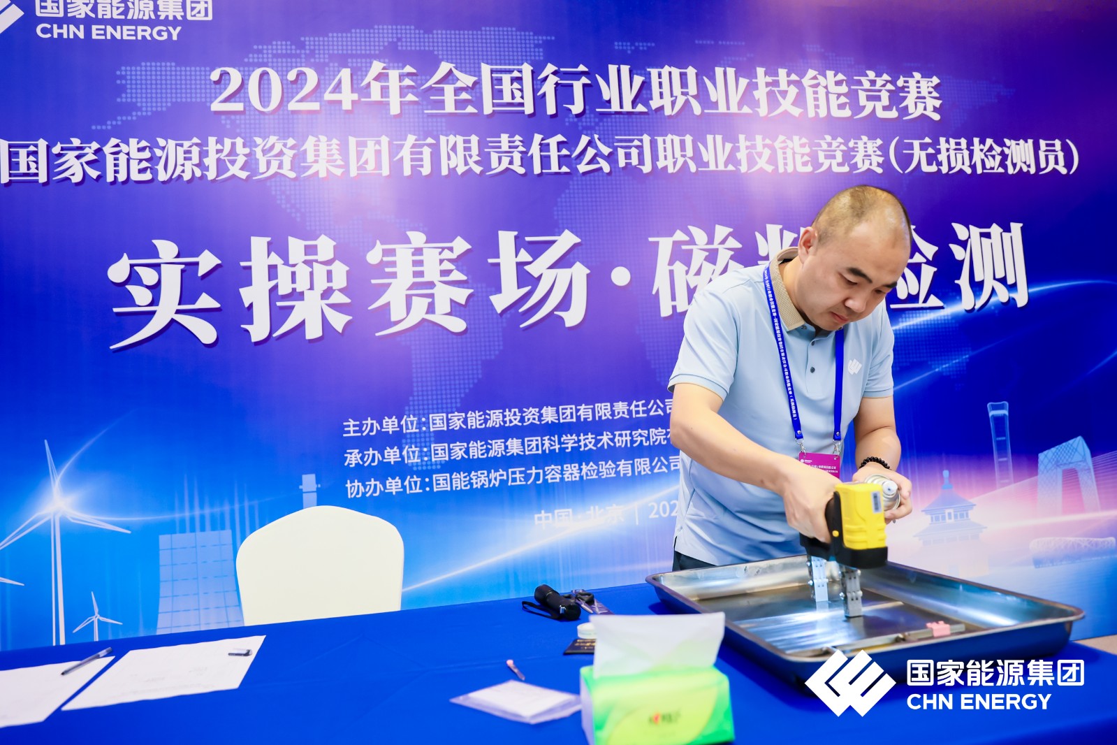 濟寧魯科助力國家能源集團2024年全國行業職業技能競賽,國家能源投資集團有限公司職業技能競賽(無損檢測員)實操賽場 ?磁粉檢測。