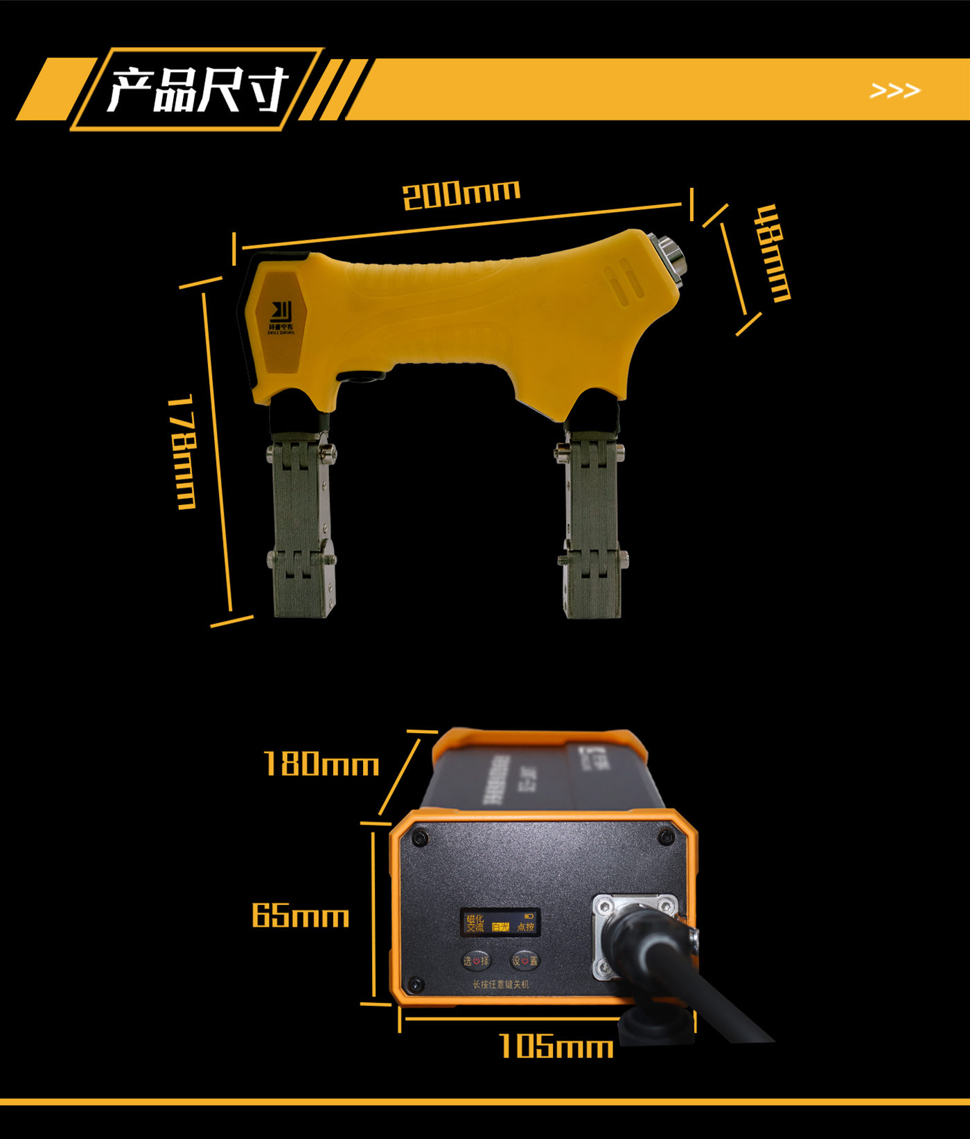 ?探頭85V-265V適配器帶有OLED顯示屏及操作按鍵,可顯示及設(shè)置直流或交流探傷模式、點按磁化或連續(xù)磁化工作模式、紫外線或白光照明模式。
