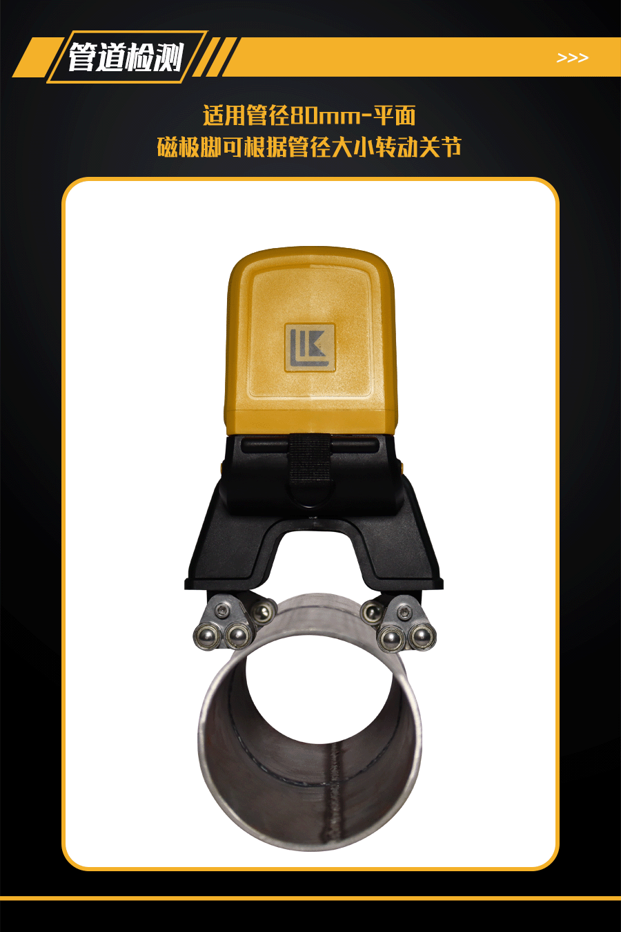 9、可檢測≥80mm直徑管道焊縫及平板焊縫;磁極腳為可轉動關節,可隨不同管徑的工件調節磁極角度,使磁極貼合管件弧面,保證探傷效果;配有管道焊縫、平板焊縫檢測2種規格磁極腳;