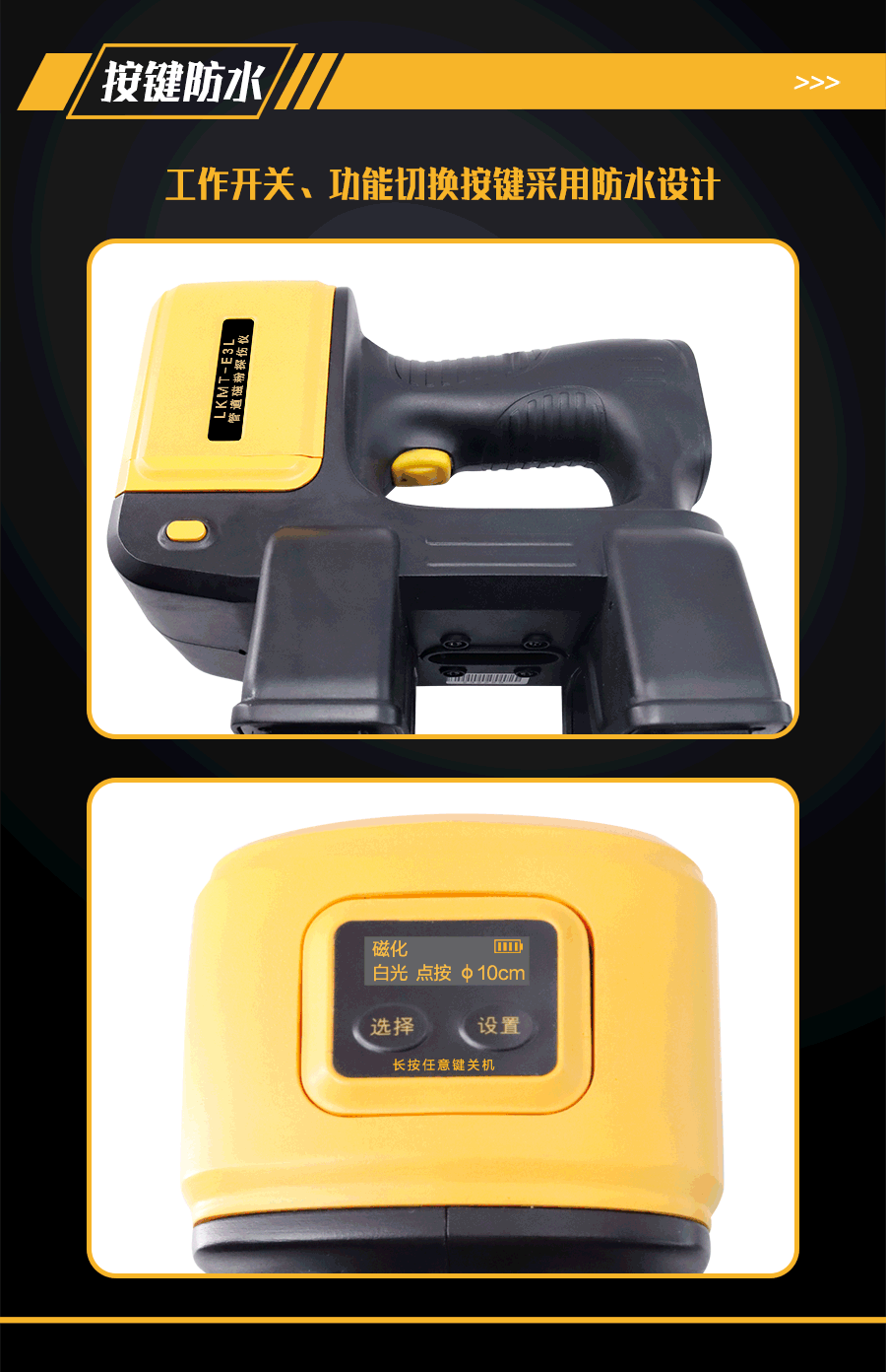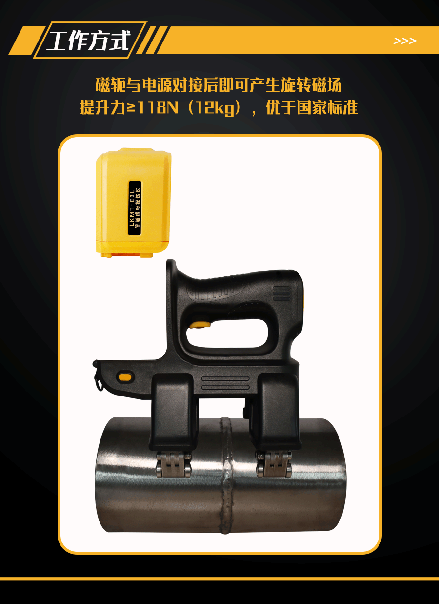1、LKMT-E3L一體式旋轉磁場管道磁粉探傷儀,探頭與鋰電池一體式設計,無需使用線鏈接;