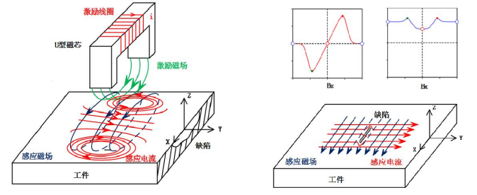交流電磁場檢測(簡稱ACFM)技術(shù)工作原理是激勵線圈在工件中感應(yīng)出均勻的交變電流,感應(yīng)電流在裂紋、腐蝕等缺陷位置產(chǎn)生擾動,電場擾動從而引起空間磁場發(fā)生畸變,利用傳感器獲得空間磁場畸變信號,從而實現(xiàn)缺陷的檢測與評估,檢測原理圖如下所示。
