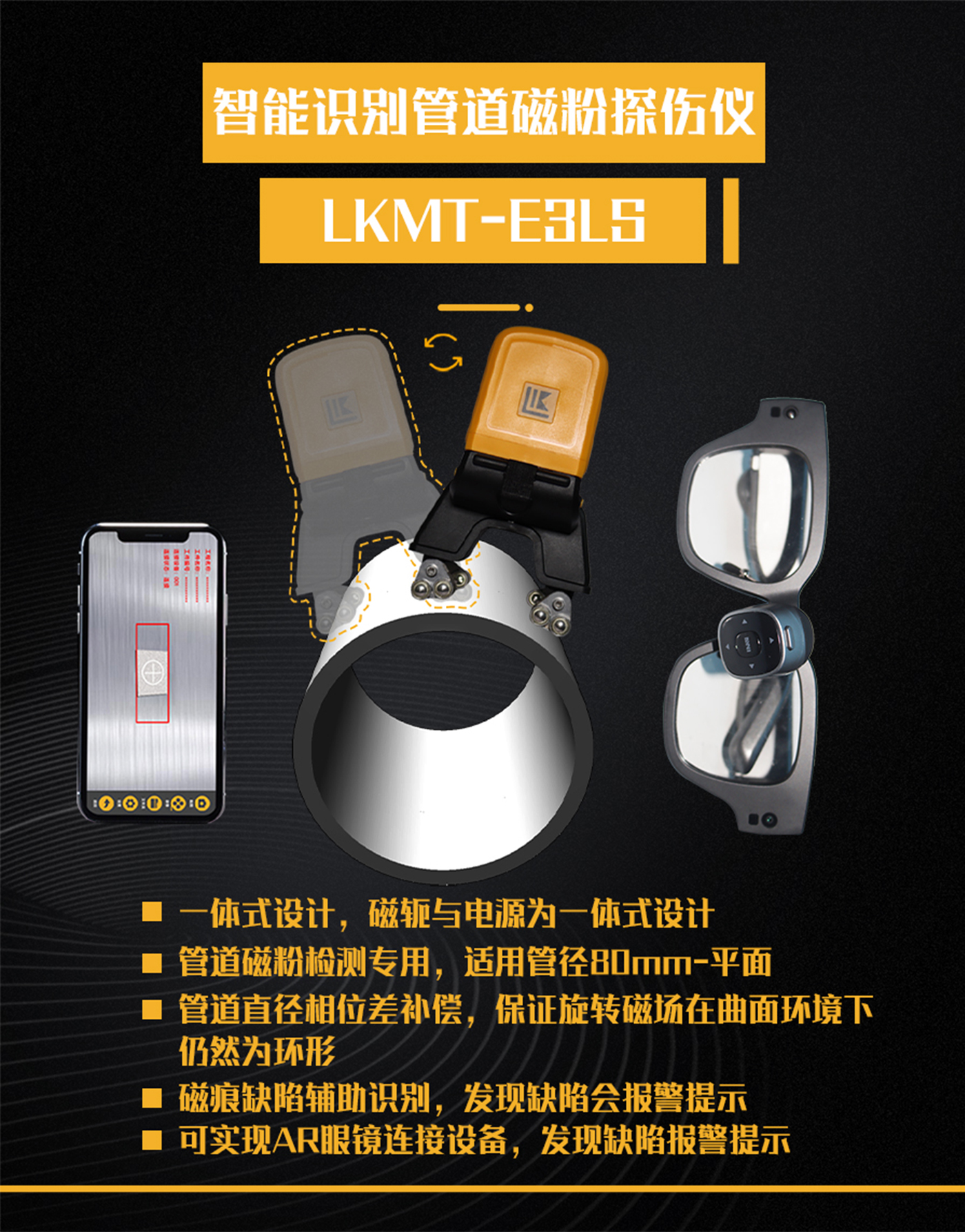 1、LKMT-E3LS一體式旋轉磁場管道磁粉探傷儀,探頭與鋰電池一體式設計,無需使用線鏈接;
