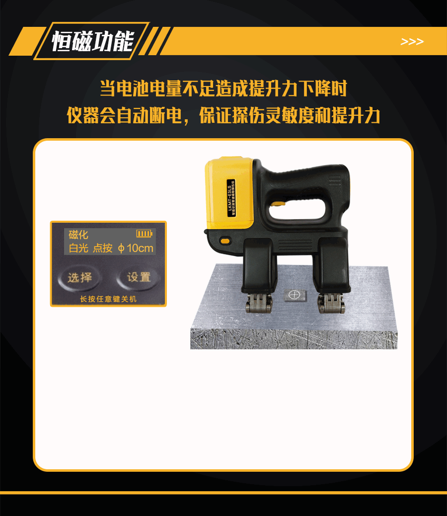 6、恒磁控制功能,因電量下降導致提升力不滿足探傷需求時自動斷電,保證探傷靈敏度;