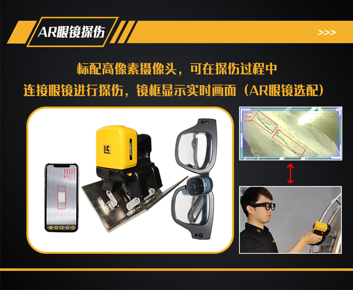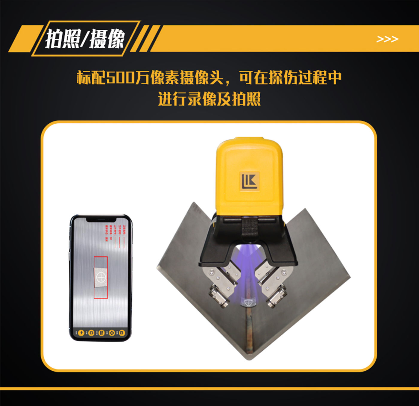 11、探頭內(nèi)部裝有500萬像素?cái)z像頭,手機(jī)、平板電腦或AR眼鏡等手持終端安裝APP軟件,通過Wi-Fi與探頭鏈接,手持終端實(shí)時(shí)顯示探傷狀態(tài);