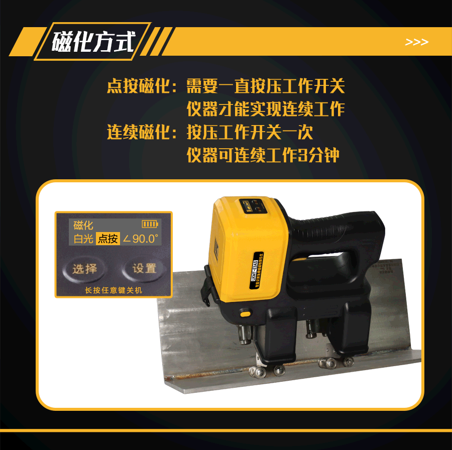 10、磁化電流相位角補(bǔ)償功能;檢測(cè)不同夾角度的角焊縫,可在鋰電池電源OLED顯示屏上設(shè)置需要探測(cè)的工件夾角,解決由于不同的板焊縫夾角會(huì)使磁極夾角改變,不能維持在90°的問題;